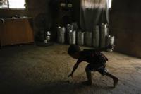 Jorman Romero, one of five children who returned to Venezuela from Mexico with their parents after abandoning plans to reach the United States amid President Donald Trump's migration crackdown, bends down to pick up a toy truck, in Maracaibo, Venezuela, Monday, June 16, 2025. (AP Photo/Matias Delacroix)