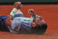 Bosnia and Herzegovina's Damir Dzumhur grimaces in pain after falling while playing France's Giovanni Mpetshi Perricard during their second round match of the French Tennis Open, at the Roland-Garros stadium, in Paris, Wednesday, May 28, 2025. (AP Photo/Lindsey Wasson)