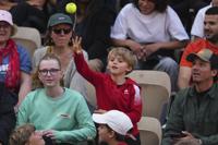 A young fan throws back a ball that landed in the stands, during the second round match of the French Tennis Open between France's Giovanni Mpetshi Perricard and Bosnia and Herzegovina's Damir Dzumhur, at the Roland-Garros stadium, in Paris, Wednesday, May 28, 2025. (AP Photo/Lindsey Wasson)