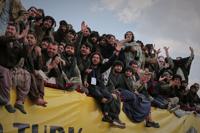 Afghan men cheer as they attend the final of Afghanistan's annual buzkashi tournament, a traditional equestrian sport in which riders compete to score points using a fake goat carcass, on the outskirts of Kabul, Afghanistan, Monday, Dec. 22, 2025. (AP Photo)