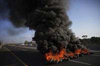Tires are set on fire to block a road during a protest demanding the immediate release of hostages held by Hamas and calling for the Israeli government to reverse its decision to take over Gaza City and other areas in the Gaza Strip, near Jerusalem, Israel, Sunday, Aug. 17, 2025. (AP Photo/Ohad Zwigenberg)