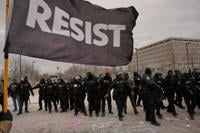 A protester carries an upside down American flag in front of federal immigration officers outside Bishop Henry Whipple Federal Building, Thursday, Jan. 15, 2026, in Minneapolis. (AP Photo/John Locher)