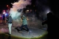 Protesters are hit with projectiles at the scene of a reported shooting Wednesday, Jan. 14, 2026, in Minneapolis. (AP Photo/John Locher)