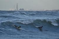 Palestinian Khalil Abu Jayyab, right, and Tahseen Abu Assi surf on the beach of Gaza City, Sunday, Dec. 28, 2025. (AP Photo/Jehad Alshrafi)