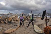 GAZA CITY, Gaza Strip (AP) — Surfers carry their boards into the Mediterranean, warm up on the sand and ride waves off the coast of Gaza City, where the shoreline bears visible damage from the Israel-Hamas war.
