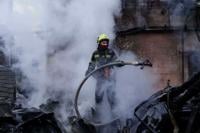 A rescue worker puts out a fire of a house destroyed after a Russian strike on Kyiv, Ukraine, on Saturday, Dec. 27, 2025. (AP Photo/Evgeniy Maloletka)