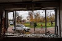 A young biathlete trains outside the destroyed ski base in Chernihiv, Ukraine, Thursday, Oct. 30, 2025. (AP Photo/Julia Demaree Nikhinson)