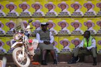Traffic police officers sit in front of campaign posters of President Yoweri Museveni, the ºÃÉ«tv Resistance Movement (NRM) presidential candidate, during the general election, in Kampala, Uganda, Thursday, Jan. 15, 2026. (AP Photo/Brian Inganga)