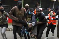 An injured protestor is carried by helpers during anti-government protests in Kenya's capital Nairobi, Thursday, Aug. 8, 2024. (AP Photo/Andrew Kasuku)