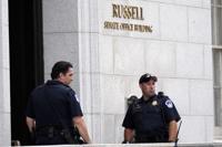 U.S. Capitol Police officers stand watch outside the Russell Senate Office Building, Wednesday, Aug. 2, 2023, on Capitol Hill in Washington Authorities issued a shelter-in-place order and began searching Senate office buildings near the U.S. Capitol Wednesday afternoon amid reports of an active shooter. (AP Photo/J. Scott Applewhite)