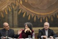 From left, Cardinal Victor Fernandez, Poet Maria Grazia Calandrone and Jesuit Father Antonio Spadaro meet the journalists during the presentation of a book by Pope Francis titled "Viva la Poesia" (long live poetry) in Rome, Friday, March 21, 2025. (AP Photo/Gregorio Borgia)