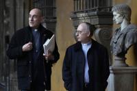 From left, Cardinal Victor Fernandez and Jesuit Father Antonio Spadaro arrive on the occasion of the presentation of a book by Pope Francis titled "Viva la Poesia" (long live poetry) in Rome, Friday, March 21, 2025. (AP Photo/Gregorio Borgia)