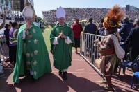 An estimated 20,000 people were singing and dancing on the field in front of the Vanimo cathedral when Francis arrived, and he promptly put on a feathered headdress that had been presented to him.