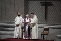 Pope Francis attends a vigil prayer in St. Peter's Basilica ahead of the start of the Synod of Bishops 16th General Assembly, at the Vatican, Tuesday Oct. 1, 2024. (AP Photo/Alessandra Tarantino)