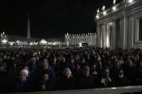 Faithful pray in St. Peter's Square, at the Vatican, during a vigil rosary for the recovery of Pope Francis, Monday, March 17, 2025. (AP Photo/Gregorio Borgia)