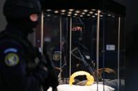 An armed gendarme stands by Dacian gold items, a 2,500-year-old helmet and wristbands, stolen from a museum in the Netherlands and then recovered by Dutch authorities, during a press conference after being returned, at the ɫtv Museum of Romanian History, in Bucharest, Romania, Tuesday, April 21, 2026. (AP Photo/Andreea Alexandru)
