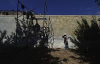 A police officer stands at the door during the counting of votes at Haile Selassie polling station in Zanzibar, Tanzania, Wednesday, Oct. 29, 2025. (AP Photo/Brian Inganga)