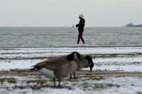A woman bundles up as she takes a walk in the snow-covered at Lake Michigan during a cold day in Chicago, Tuesday, Nov. 11, 2025. (AP Photo/Nam Y. Huh)