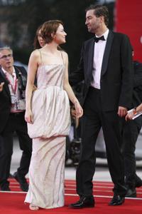 Emma Stone, left, and Dave McCary pose for photographers on the red carpet for the film 'Bugonia' during the 82nd edition of the Venice Film Festival in Venice, Italy, on Thursday, Aug. 28, 2025. (Photo by Scott A Garfitt/Invision/AP)