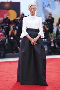 Tilda Swinton poses for photographers on the red carpet for the opening ceremony and the premiere of the film 'La Grazia' during the 82nd edition of the Venice Film Festival in Venice, Italy, on Wednesday, Aug. 27, 2025. (Photo by Scott A Garfitt/Invision/AP)