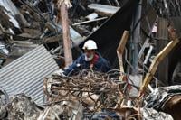 A firefighter searches through the rubble of a burnt building of a multistory shopping plaza following a massive fire in Karachi, Pakistan, Monday, Jan. 19, 2026. (AP Photo/Ali Raza)