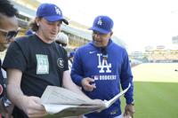 Samuel O'Neal, left, editor-in-chief of Temple News, shows a copy of his school's publication to Los Angeles Dodgers manager Dave Roberts during a visit to Dodger Stadium, Wednesday, May 14, 2025, in Los Angeles. AP Photo/Jayne Kamin-Oncea)