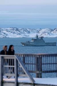 FILE - Military vessel HDMS Ejnar Mikkelsen of the Royal Danish Navy patrols near Nuuk, Greenland, Jan. 15, 2026. (AP Photo/Evgeniy Maloletka, File)