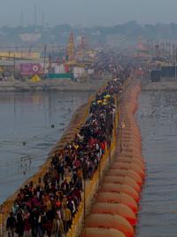 FILE - Indian Hindu devotees cross a bridge as they return after a holy dip on Mauni Amavasya, a divine occasion in Hindu religious practice followed for honoring ancestors or forefathers, at the Sangam, the confluence of the Ganges, the Yamuna and the mythical Saraswati rivers, during the annual month long Hindu religious fair "Magh Mela" in Prayagraj, India, Jan. 18, 2026. (AP Photo/Rajesh Kumar Singh), File