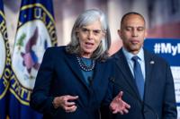 Rep. Katherine Clark, D-Mass., the House minority whip, is joined at right by House Minority Leader Hakeem Jeffries, D-N.Y., during a news conference on day 22 of the government shutdown to discuss the how the crisis can impact health care, at the Capitol in Washington, Wednesday, Oct. 22, 2025. (AP Photo/J. Scott Applewhite)