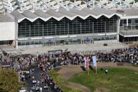 People gather outside the train station on the first anniversary of the disaster that killed 16 people, in Novi Sad, Serbia, Saturday, Nov. 1, 2025. (AP Photo/Darko Vojinovic)