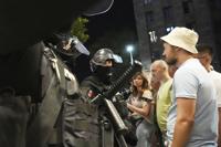 An anti-government protester talks to police officers during an anti-government protest in Belgrade, Serbia, Thursday, Aug. 14, 2025. (AP Photo/Darko Vojinovic)