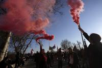 People light up smoke flares as they march during a protest over the collapse of a concrete canopy that killed 15 people more than two months ago, in Novi Sad, Serbia, Saturday, Feb. 1, 2025. (AP Photo/Darko Vojinovic)