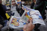 Staff of Japan's sports newspaper, The Hochi Shimbun, hands over a copy of the extra issue published after the Los Angeles Dodgers Shohei Ohtani won a Most Valuable Player award, to passersby in Tokyo, Friday, Nov. 14, 2025. (AP Photo/Koji Ueda)