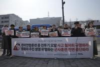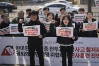 Protesters attend a press conference demanding to stop the upcoming Freedom Shield military exercise between the U.S. and South Korea and also demanding to investigate the cause thoroughly about fighter jets accidentally dropped eight bombs on a civilian area, in Seoul, South Korea, Friday, March 7, 2025. A banner reads "Stop the Freedom Shield military exercise between the U.S. and South Korea and Demand to Investigate the cause thoroughly about fighter jets accidentally dropped eight bombs." (AP Photo/Lee Jin-man)