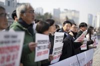 Protesters attend a press conference demanding to stop the upcoming Freedom Shield military exercise between the U.S. and South Korea and also demanding to investigate the cause thoroughly about fighter jets accidentally dropped eight bombs on a civilian area, in Seoul, South Korea, Friday, March 7, 2025. Banners read "Stop the Freedom Shield military exercise between the U.S. and South Korea." (AP Photo/Lee Jin-man)
