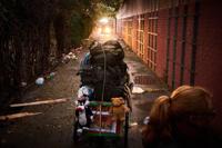 On leaving the school, people loaded their belongings onto carts, some used as trailers led by bicycles, to haul them away.