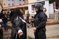 A migrant argues with a riot police officer as police begin carrying out eviction orders at an abandoned school building where hundreds of mostly undocumented migrants had been living, in Badalona, near Barcelona, Spain, Wednesday, Dec. 17, 2025. (AP Photo/Emilio Morenatti)