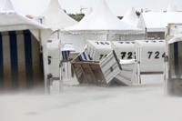 Sand sweeps across overturned beach charis during a storm in Sankt Peter Ording, northern Germany, Monday, Aug. 7, 2023. Stormy weather across the Baltic Sea region is causing airport delays, suspended ferry service, minor power outages and lots of rain. (Bodo Marks/dpa via AP)