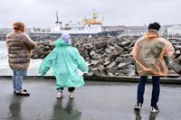 People stand in windy weather on the outer pier at Hirtshals Harbour, Denmark, Monday, Aug. 7, 2023. Stormy weather across northern Europe has caused airport delays, suspended ferry service and a train’s partial derailment. (Henning Bagger/Ritzau Scanpix via AP)