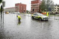 A police car is parked as an officer tries to open drains in a flooded street in Oslo following a heavy storm, Monday, Aug. 7, 2023. Stormy weather across the Baltic Sea region Monday caused airport delays, suspended ferry service, minor power outages and lots of rain. (Frederik Ringnes/NTB Scanpix via AP)