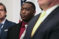 Temarkus Washington, who says the sexual abuse he experienced as a teenager at a troubled Chicago juvenile detention center still gives him nightmares, listens as an attorney speaks to reporters in Chicago on Tuesday, July 23, 2024. Lawsuits filed Monday on behalf of 193 men and women, detail instances of rape, unlawful strip searches and other abuse by adult employees of the detention center from 1995 to 2022. (AP Photo/Teresa Crawford)