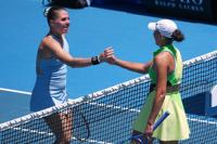 Madison Keys, right, of the U.S. is congratulated by Oleksandra Oliynykova of Ukraine following their first round match at the Australian Open tennis championship in Melbourne, Australia, Tuesday, Jan. 20, 2026. (AP Photo/Asanka Brendon Ratnayake)