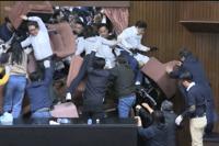 Photos and videos of the morning clash showed chaotic scenes with ºÃÉ«tvist members trying to remove or push their way through the barriers of chairs or clamber over a ledge in front of the speaker's area. Lawmakers from the other side shoved them and the chairs back and squirted or flung mineral water at them from plastic bottles.