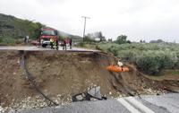 Firefighters use ropes to lift a kidney patient in a stretcher across a road damaged by a rainstorm in Kala Nera village, near Volos, central Greece, Wednesday, Sept. 6, 2023. The death toll from severe rainstorms that lashed parts of Greece, Turkey and Bulgaria increased Wednesday after rescue teams located the body of a missing vacationer who was swept away by flood waters that raged through a campsite in northwest Turkey. (AP Photo/Thodoris Nikolaou)