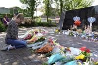 FILE - A visitor prays at a memorial to the seven people killed and others injured in the Fourth of July mass shooting at the Highland Park War Memorial in Highland Park, Ill., July 7, 2022. Keely Roberts, the mother of the youngest victims of the Fourth of July parade shooting, which left one of her twin sons — now 10 — paralyzed from the waist down, will talk to the media Wednesday, July 3, 2024, about what it means to survive the horror two years later. (AP Photo/Nam Y. Huh, File)