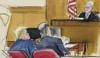 As prosecutor Christopher Conroy and Tarasoff plodded through a series of checks, stubs and vouchers related to the Cohen payments, Trump gestured at the tabletop monitor displaying the documents and briefly whispered with defense attorney Emil Bove.