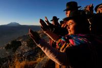 Aymara Indigenous people hold up their hands to receive the first rays of sunlight in celebration of the Andean New Year 5533, marking the Southern Hemisphere's winter solstice, in El Alto, Bolivia, June 21, 2025. (AP Photo/Juan Karita, File)