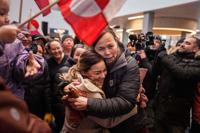 Greenland Minister for Foreign Affairs and Research Vivian Motzfeldt, center right, hugs a woman after arrival at the airport in Nuuk, Greenland, on Tuesday, Jan. 20, 2026. (AP Photo/Evgeniy Maloletka)
