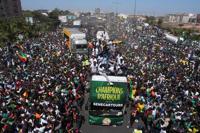 The Senegalese soccer team rides through thousands of cheering fans celebrating their victory in the Africa Cup of Nations soccer tournament, in Dakar, Senegal, Tuesday, Jan. 20, 2026. (AP Photo/Misper Apawu)