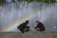 A couple play cards near a fountain in St. Petersburg, Russia, Tuesday, June 3, 2025. (AP Photo/Dmitri Lovetsky)
